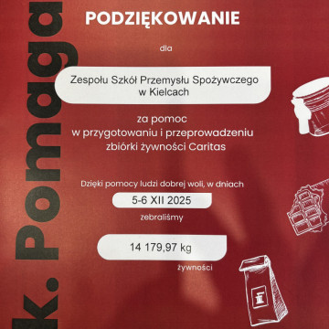 Podziękowanie dla naszej szkoły za pomoc Caritas