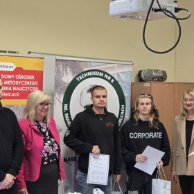 W dniu 1 grudnia br. w Zespole Szkół nr 3 w Kielcach r. odbyło się uroczyste wręczenie nagród za udział w „EnVET” V Miejskim Konkursie Języka Angielskiego Z Elementami Języka Angielskiego Zawodowego. Nasi uczniowie Jakub Burczyn oraz Maxymilian Piśkiewicz z klasy 5c zajęli zaszczytne II miejsce za pracę zespołową. Dodatkowo Jakub Burczyn został wyróżniony za pracę indywidualną. Serdecznie gratulujemy !!!