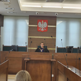 Odwiedziliśmy archiwum, niebieski pokój, "dołek" oraz salę rozpraw, gdzie sędziowie opowiadali o swojej pracy i roli sądu w życiu społecznym. Na zakończenie otrzymaliśmy wyjątkowy prezent- egzemplarz Konstytucji RP wraz z pamiątkową smyczą i listem od Pani Prezes Sądu.