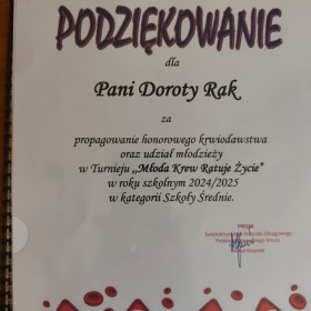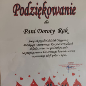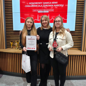 21 listopada br. w Urzędzie Wojewódzkim w Kielcach odbyła się uroczysta gala z okazji Dni Honorowego Krwiodawstwa. Na zaproszenie Świętokrzyskiego Oddziału PCK w uroczystości wzięły udział: opiekunka Szkolnego Koła PCK p. Dorota Rak oraz przedstawicielki Szkolnego Klubu Honorowych Dawców Krwi, uczennice klasy 5d Magdalena Dawgert i Natalia Chrzanowska. Podczas uroczystości zostały wręczone odznaczenia państwowe i honorowe PCK, odznaki ZHDK, dyplomy oraz nagrody. Nasza szkoła została uhonorowana dyplomem oraz okolicznościową statuetką za udział w akcjach poboru krwi oraz za udział uczniów w Turnieju ,,Młoda Krew Ratuje Życie"❤️❤️❤️