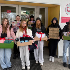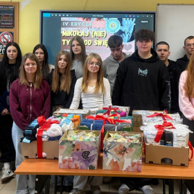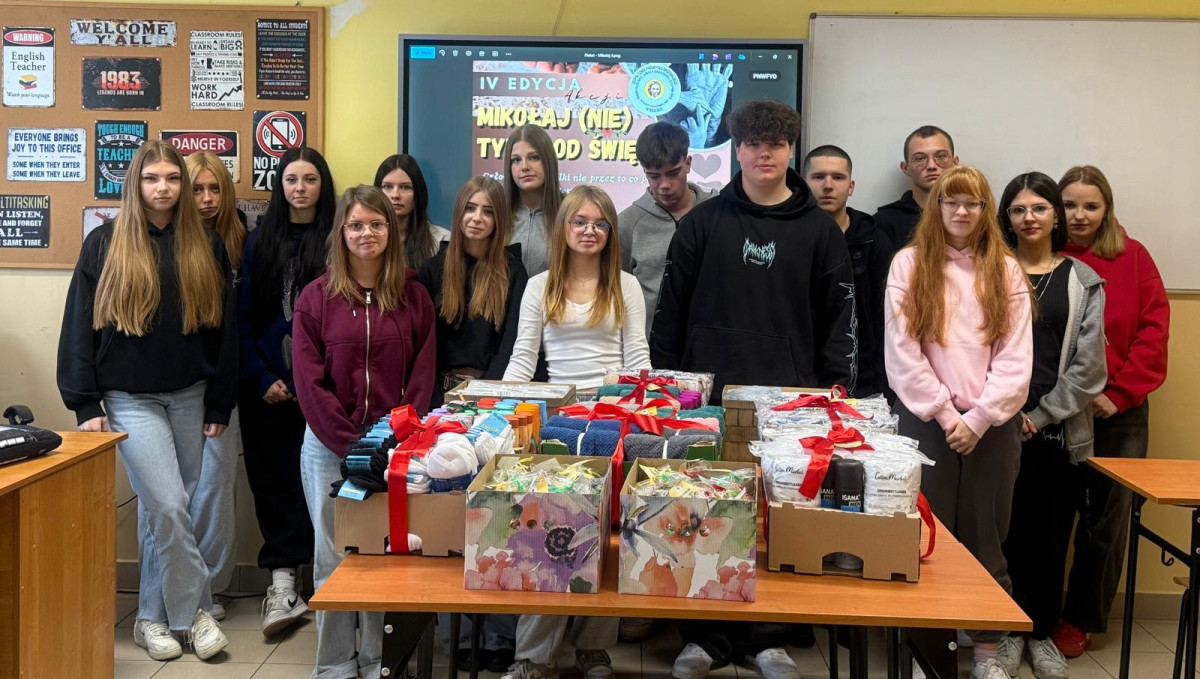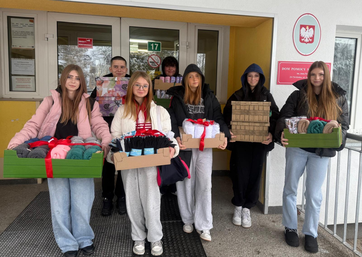 24.11.2025 r. miało miejsce zwieńczenie akcji charytatywnej „Mikołaj (nie)tylko od święta IV”. Delegacja uczniów klasy 2 A wraz z wychowawczynią p. Kamilą Kmiecik odwiedziła mieszkańców Domu Pomocy Społecznej im. Jana Pawła II przy ul. Jagiellońskiej w Kielcach. Podczas tego spotkania uczniowie przekazali potrzebne rzeczy, m.in. komplety pościeli, prześcieradła, ręczniki, podkoszulki i skarpetki. W podarunkach zalazły się także artykuły higieniczne jak szampony, żele pod prysznic, pianki oraz maszynki do golenia. Dzięki pomocy p. Elżbiety Kumalskiej i uczniów z klasy 3b udało się przygotować także słodki upominek w postaci własnoręcznie przygotowanych pierniczków, co było miłą niespodzianką dla mieszkańców.